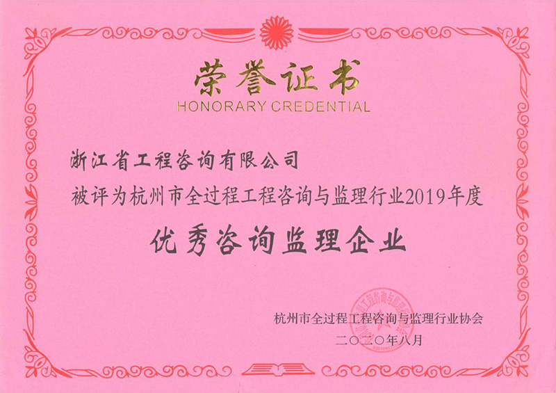 根据杭州市全过程工程咨询与监理行业协会五届五次理事会决议精神和杭咨监协(2020)7号文件,经协会秘书处初审,评选表彰活动评审委员会评审,我公司被评为杭州市全过程工程咨询与监理行业2019年度优秀咨询监理企业。