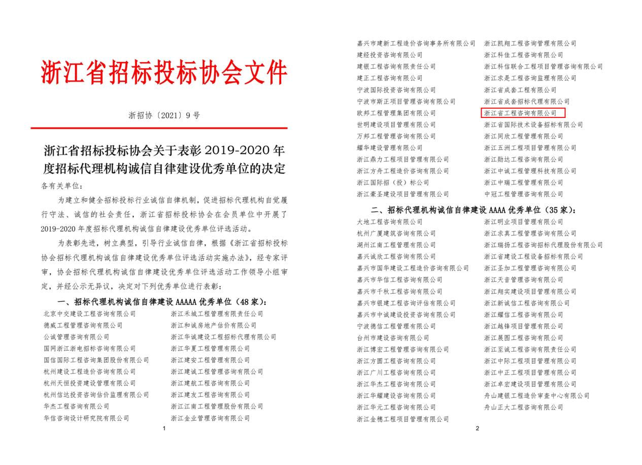 近日,根据《浙江省招标投标协会招标代理机构诚信自律建设优秀单位评选活动实施办法》,经专家评审,协会招标代理机构诚信自律建设优秀单位评选活动工作领导小组审定,我公司被评为2019-2020年度招标代理机构诚信自律建设AAAAA优秀单位。公司已连续多年获得招标代理机构诚信自律建设AAAAA优秀单位。