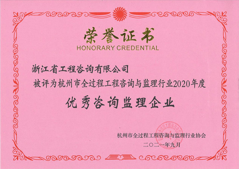 近日,根据杭州市全过程工程咨询与监理行业协会六届一次理事会决议和杭咨监协(2021)5号文件精神,经协会秘书处初审,评选表彰活动评审委员会评审,我公司被评为杭州市全过程工程咨询与监理行业2020年度优秀咨询监理企业。