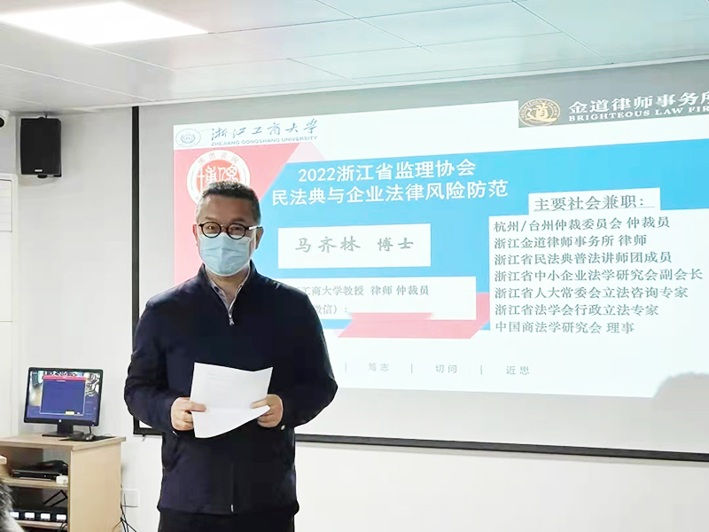 金道所兼职律师、浙江工商大学教授马齐林主讲《民法典与企业风险防范》专题。马教授解读《民法典》虽名为“民”,实则“民商合一”,与商业经营存在密不可分的关系,着重分析阐述了构成企业法律风险的基本要素、法人决议瑕疵风险及其责任后果等问题,提出企业建立健全法律风险防御机制的重要性。