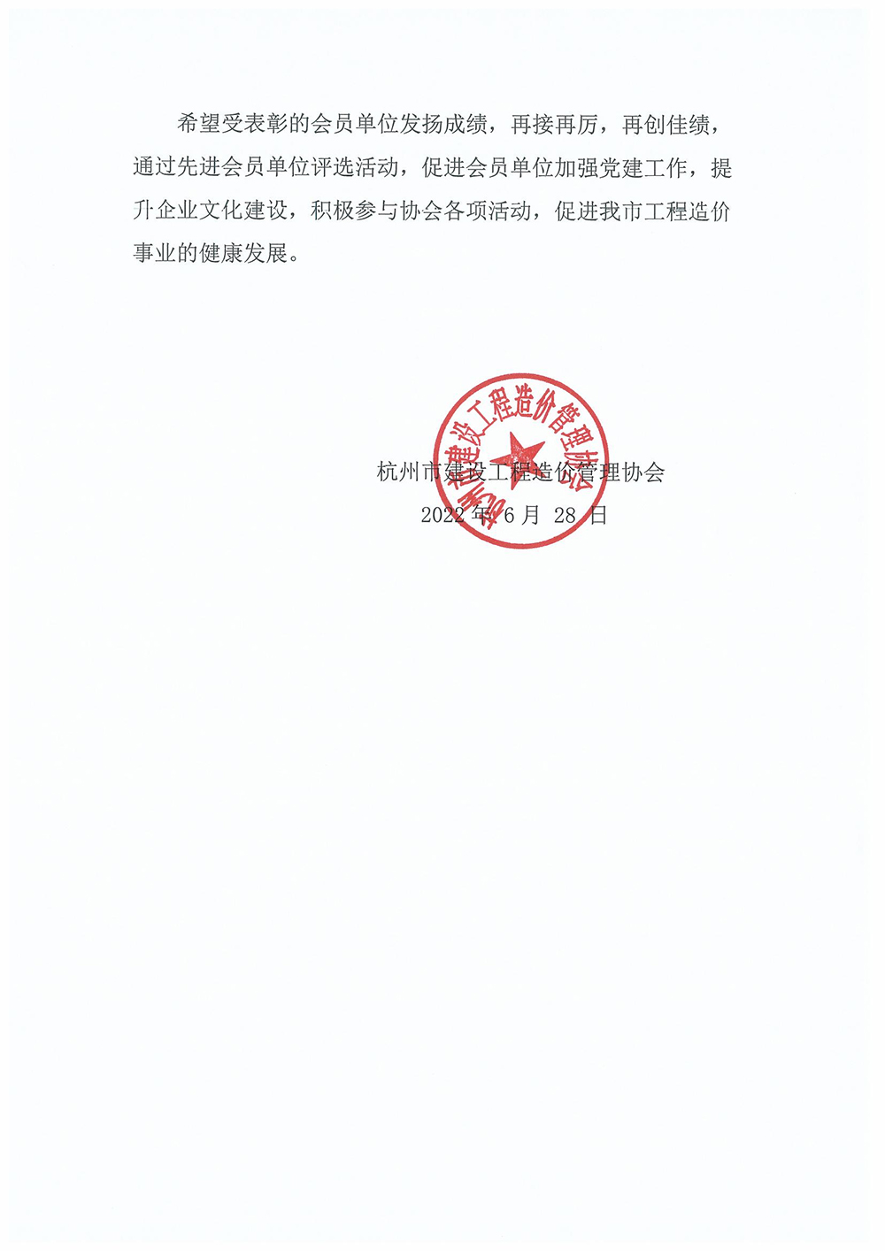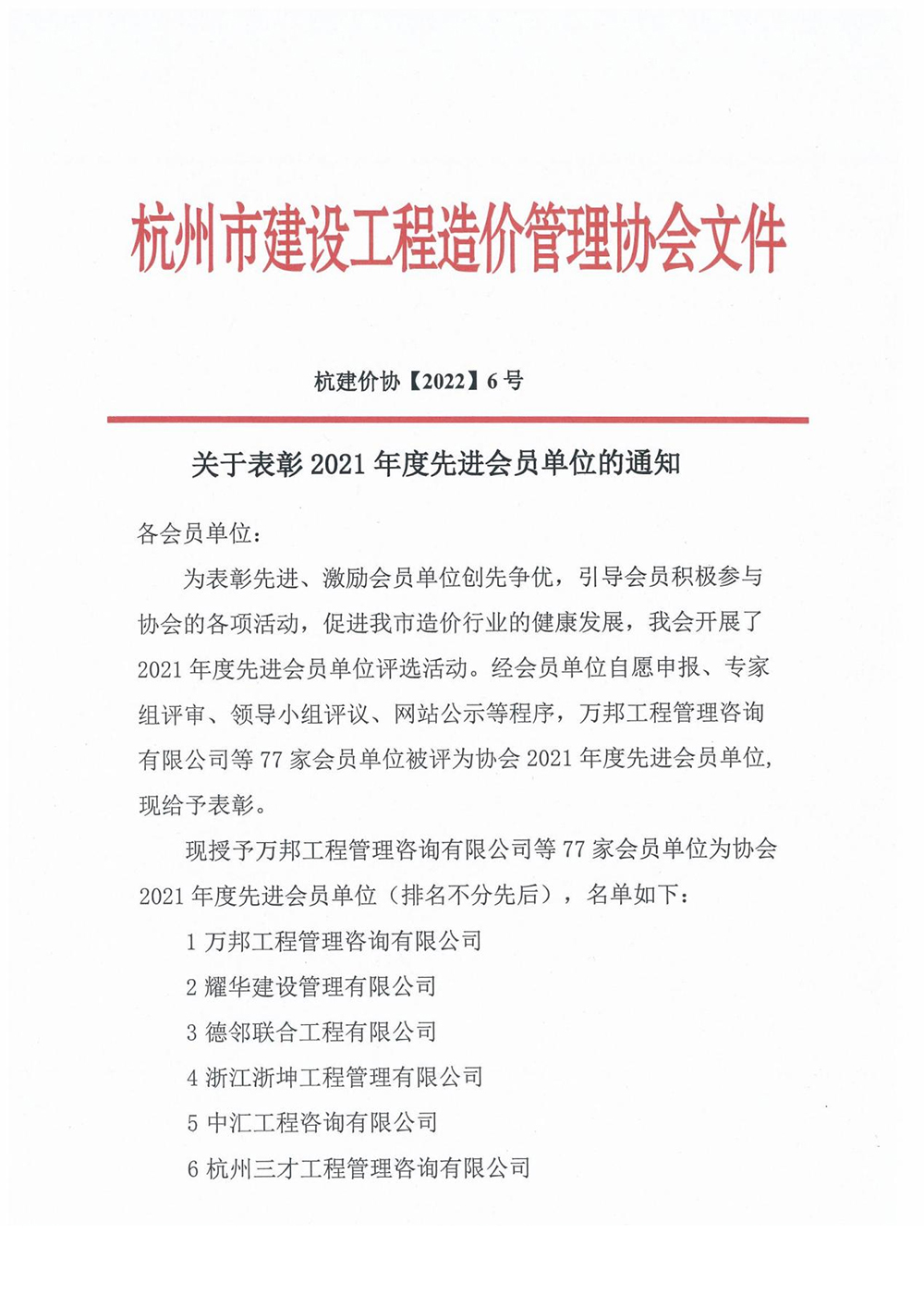 公司取得杭州市建设工程造价管理协会2021年度先进会员单位荣誉称号