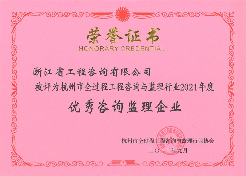 近日,根据杭州市全过程工程咨询与监理行业协会六届二次理事会决议精神和杭咨监协(2022)7号文件,杭州市全过程工程咨询与监理行业协会组织开展了杭州市咨询监理行业2021年度优秀(先进)集体和个人选树活动。经协会秘书处初审,选树活动评审委员会评审,我公司被评为杭州市全过程工程咨询与监理行业2021年度优秀咨询监理企业。