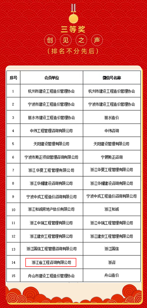 近日,浙江省建设工程造价管理协会举办了2022年度浙江省工程造价行业“浙江造价•新锐之声”评选活动,我公司公众号从报名的近200家单位,入围的51个微信公众号中脱颖而出,荣获三等奖2022年度“浙江造价•创见之声”。