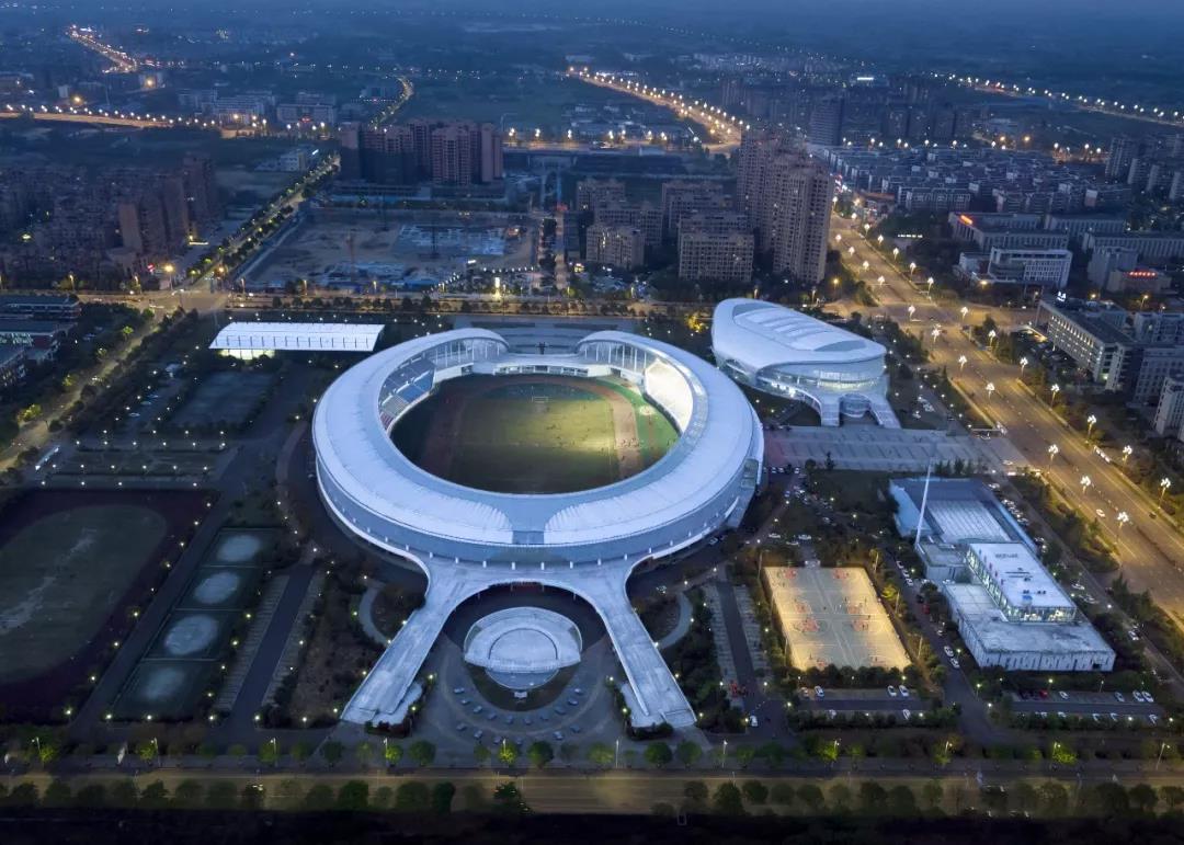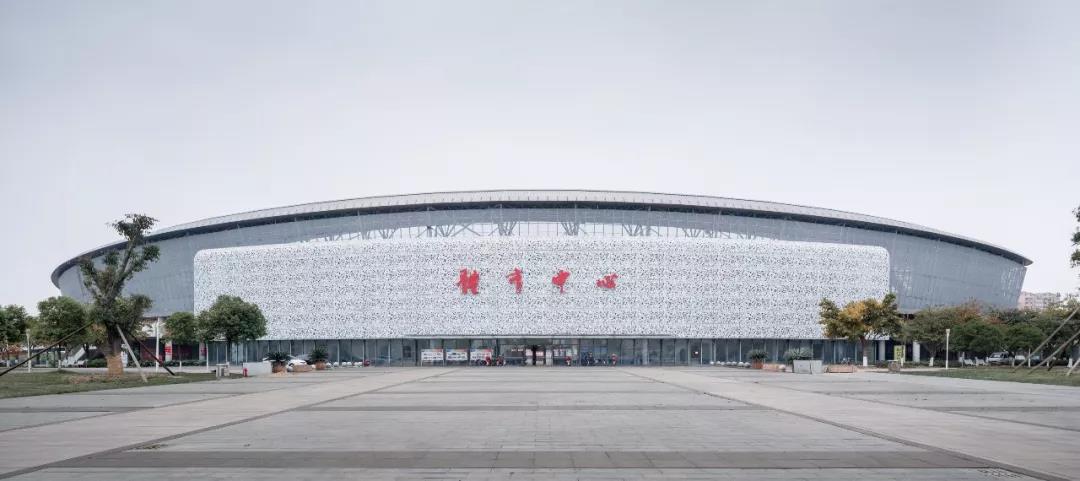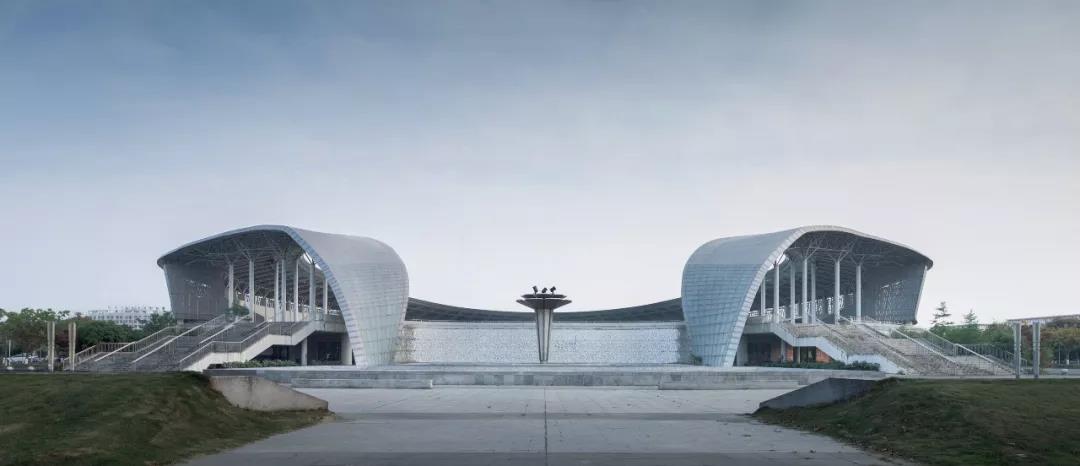绵竹体育中心利用原未实施完成的旧体育场改造建设,原场地曾在2008年地震中临时存放罹难者遗体,新设计的主旨便被定义为“纪念”与“希望”。主体育场屋面既以双臂“环抱”的姿态守护对逝者的记忆,又以“舞动”的姿态激励生者的勇气。建筑北向广场中心设一处浅水,浅水水底藏一道勾缝,形成裂痕之路,两壁与底部以浮雕的形式记刻地震时期的故事:关于灾难、救助,以及生命的意义。与裂缝垂直方向设置烛台意向的圣火柱,既表达祭奠,又寓意希望。绵竹木板年画享有盛誉,设计选取其中意喻为“希望与丰收”的主题年画镂刻在建筑表皮的穿孔铝板纹样中,光线经外层镂空铝板的孔隙将年画投射在内层玻璃幕墙之上,使得整个新建筑光影层次丰富,地域特色鲜明灵动。